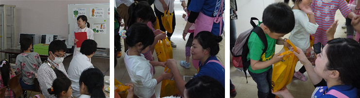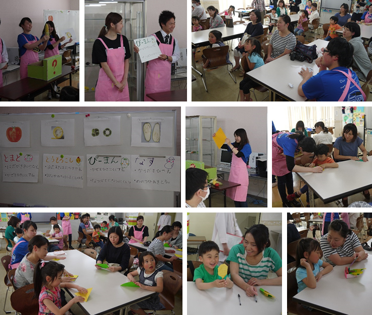オレンジゼリーが冷え固まり、カップケーキが焼きあがるのを待つ間、食物栄養学科・保育学科の両学生ボランティアによる野菜講座が行われました。はじめは、野菜クイズをし、色々な野菜の断面の写真を見せ、何の野菜か当ててもらいました。そして、実物を見せながら、その野菜の働きについて分かりやすく説明しました。続いて、折り紙で野菜作りに挑戦しました。黄色と緑色の両面折り紙を使って、とうもろこしを折りました。仕上げに、ペンで粒の線を描いたら出来上がりです。パクパクと食べる真似をする子どももいました。最後に、学生ボランティアから、野菜クイズにも出てきたほかの野菜(トマト、ピーマン、ナス)の折り紙をプレゼントされ、子どもたちはとてもうれしそうでした。