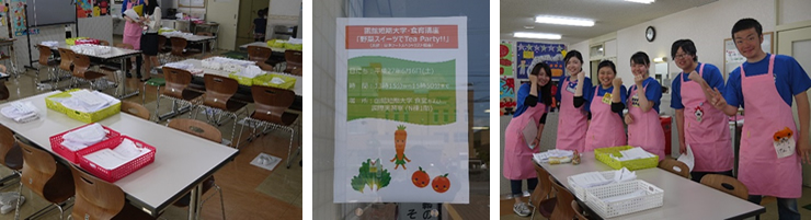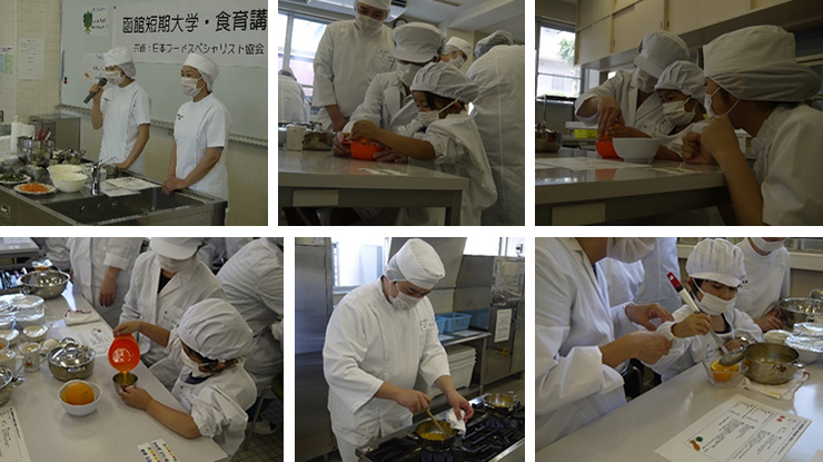 函館短期大学では、函館市内の子どもとその親を対象に、“野菜スイーツでTEA PARTY!!”というテーマで食育講座(共催:日本フードスペシャリスト協会)を開催いたしました。本学の所在する北海道ではたくさんの野菜が生産されていますが、嫌いな食べ物の代表格としてその野菜が挙げられることも少なくありません。実際に野菜に触れたり、親子で一緒に調理したりすることで、野菜を好きになり、そのおいしさに改めて気づいてもらえたらと考え、本講座を開催いたしました。調理実習では、昨年度に引き続き北海道産の食材(卵、牛乳、ほうれん草など)を使用し、“3時のおやつ”として野菜のカップケーキとオレンジゼリーを作りました。また、調理実習後には、ボランティアとして参加した本学食物栄養学科で栄養教諭を目指す学生や、本学保育学科で保育士・幼稚園教諭を目指す学生が野菜講座を開き、様々な野菜の特徴を、実際に提示したりクイズ形式で出題したりして楽しみました。本講座を受講する子どもたちと触れ合うことで、学生の将来の職業・資格に対する意識を明確化することも目指しています。
