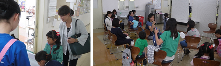 子どもたちは、学生ボランティアに手伝ってもらいながら白衣に着替え、靴を履き替えて、帽子・マスクを装着して調理室へ移動しました。しっかり手を洗えば準備万端です。学生ボランティアの岡本さんと丹野さんが先生となり、お手本を示しながら調理を進めました。