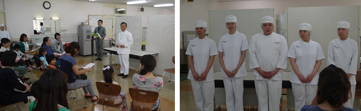 本学保育学科の三沢大樹専任講師が司会を務めました。はじめに猪上徳雄学長より開講の挨拶を行いました。何でも手に入り何でも食べられる時代だからこそ、身体のことを考えて、自分自身で選び、工夫しながら食べてほしいと話されました。その後、司会より本日のスケジュールとメニューの説明、教員および学生ボランティアの紹介が行われました。